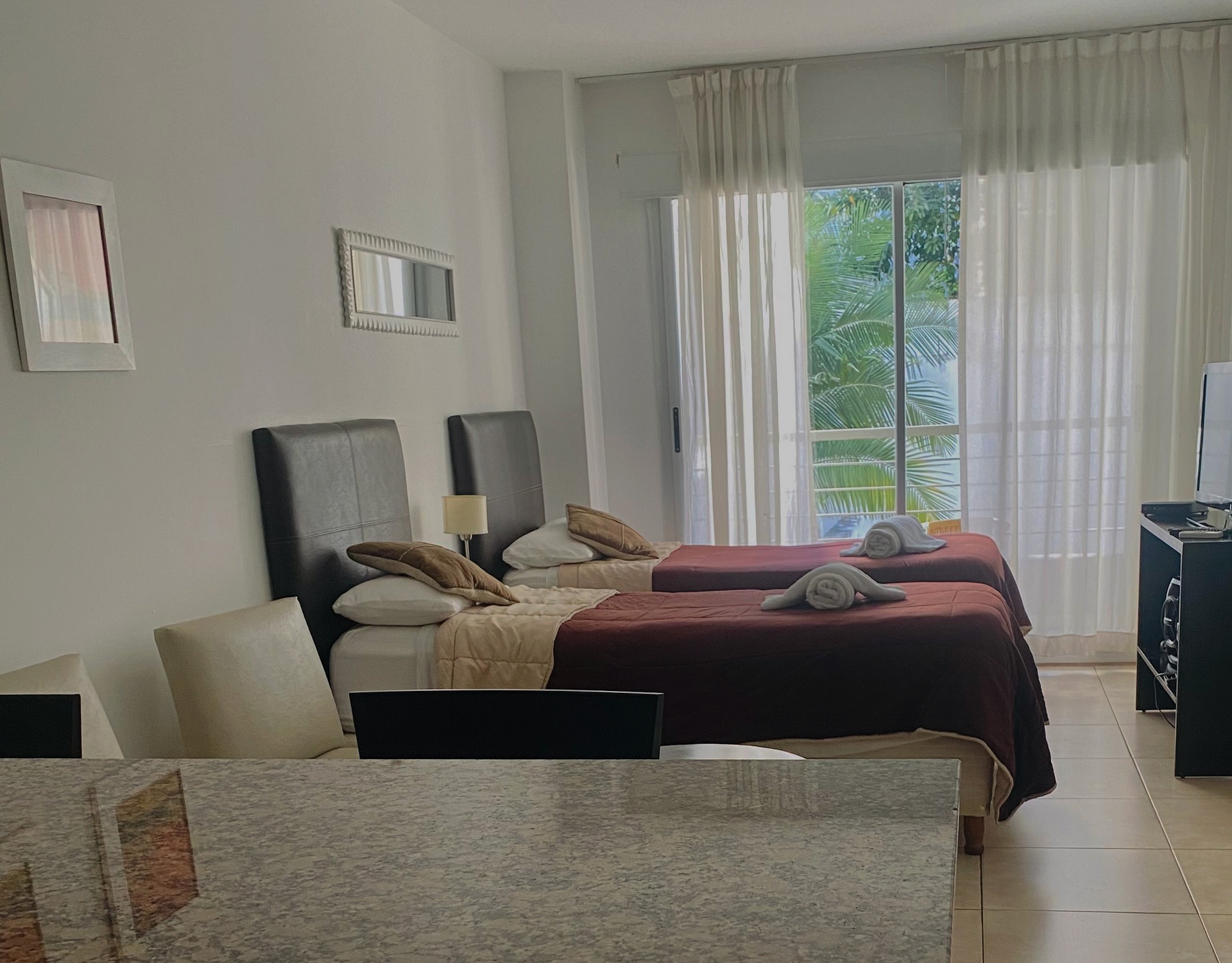 2 huéspedes Monoambiente de 30m2 con balcón. Dos camas singles, cocina integrada, heladera con freezer y baño completo.